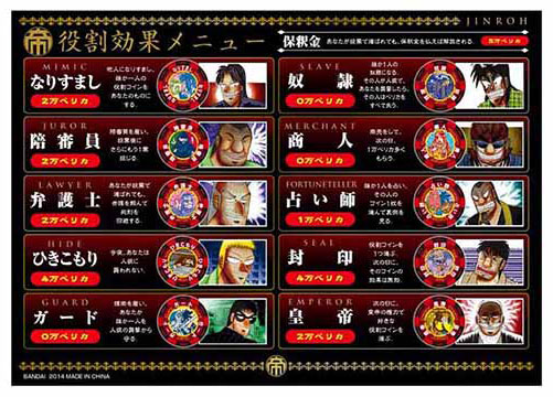 皇帝・奴隷などカイジファンお馴染みのオリジナル役割などが存在し、役職は1日毎に日替わりで変更となります。