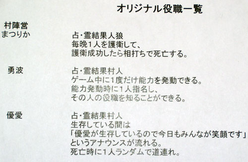 - ※【優愛】=オリジナル役職。村陣営。生存している間は 「優愛が生存しているので今日もみんなが笑顔です。」というアナウンスが流れる。 死亡時にランダムで道連れ。